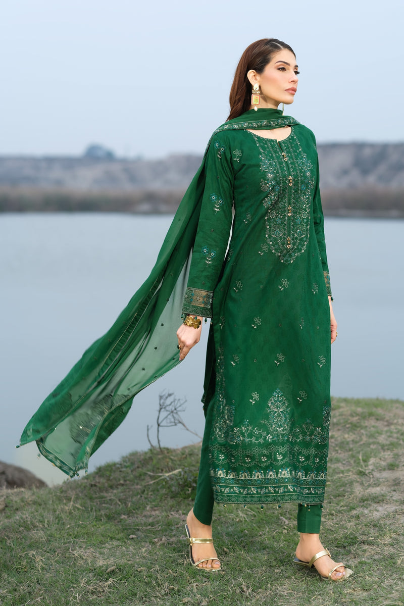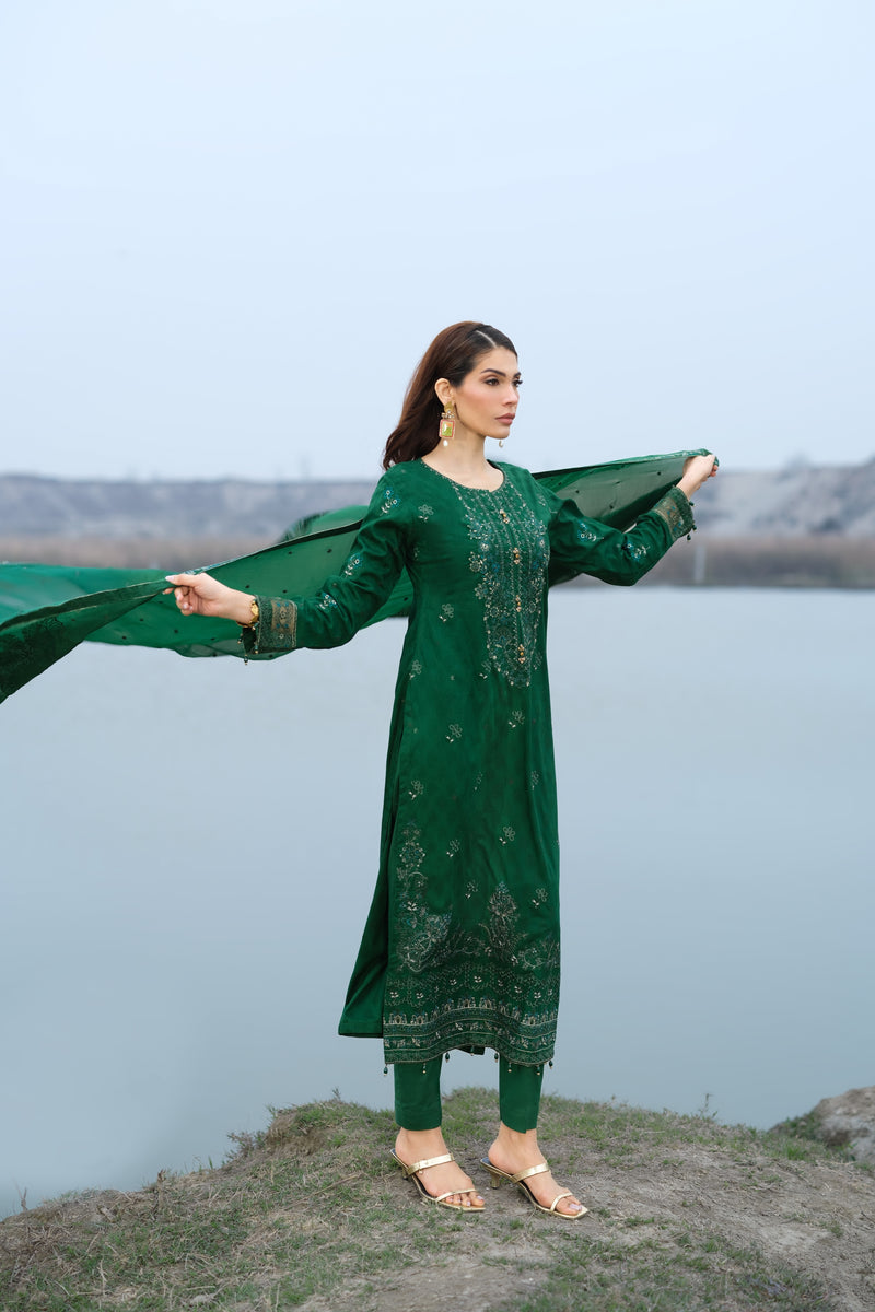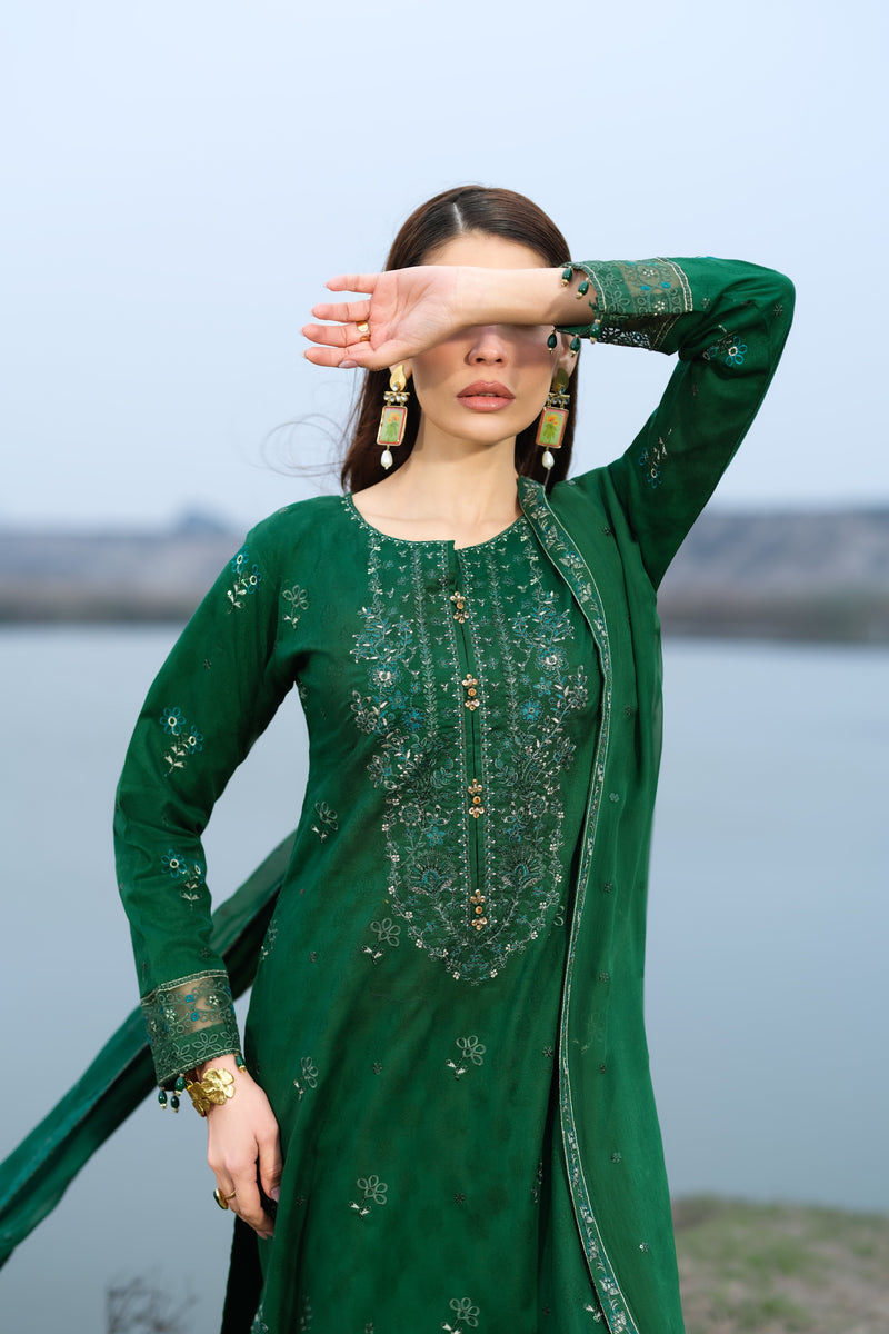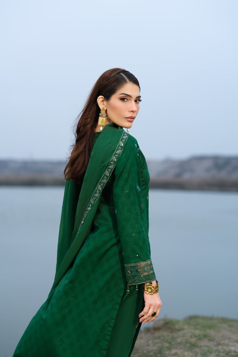Embroidered jacquard shirt with cotton trousers and embroidered chiffon dupatta.
