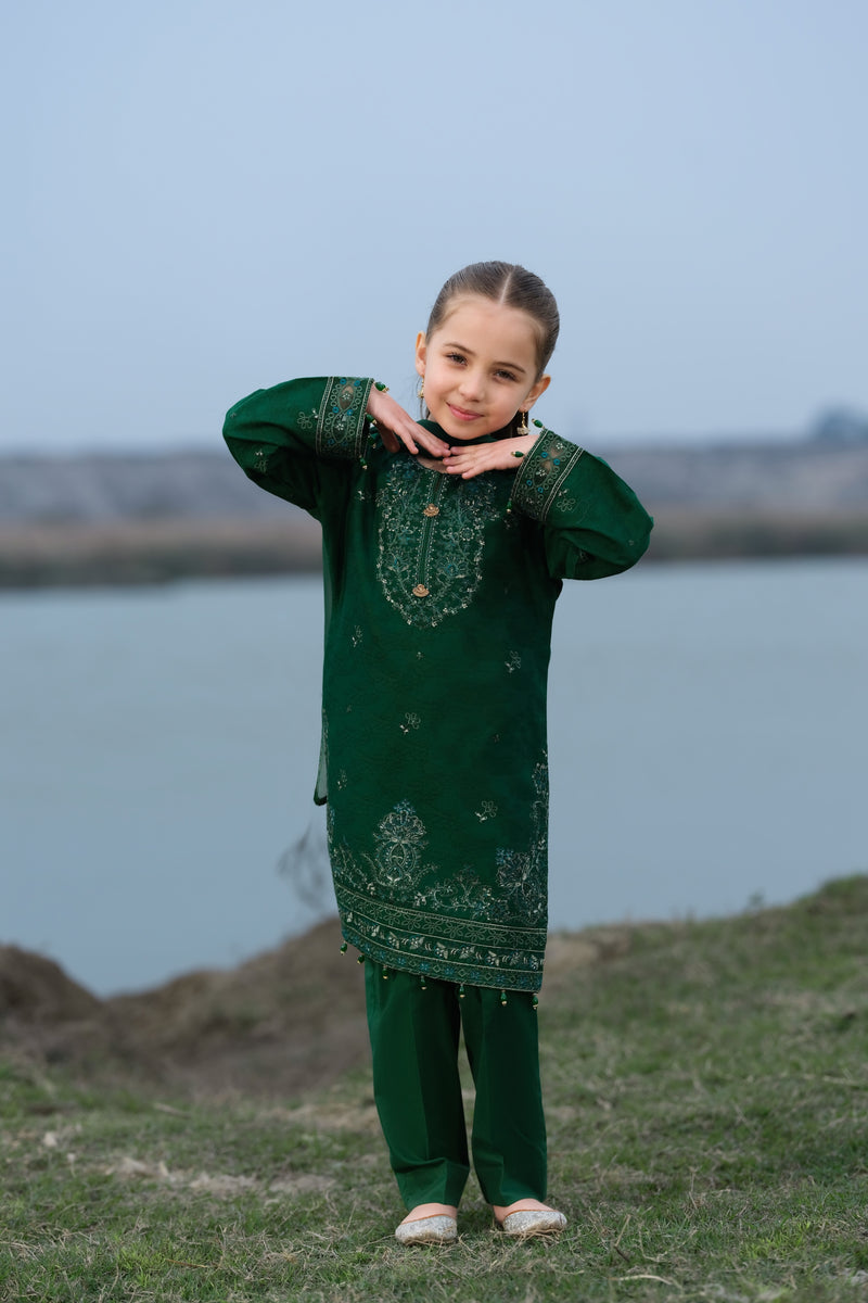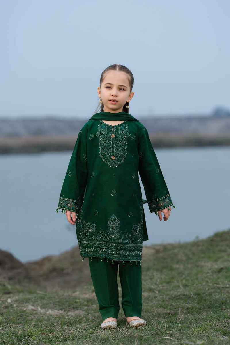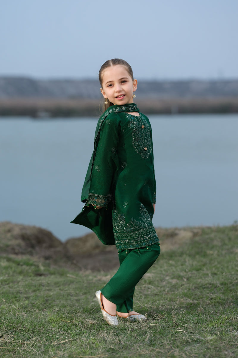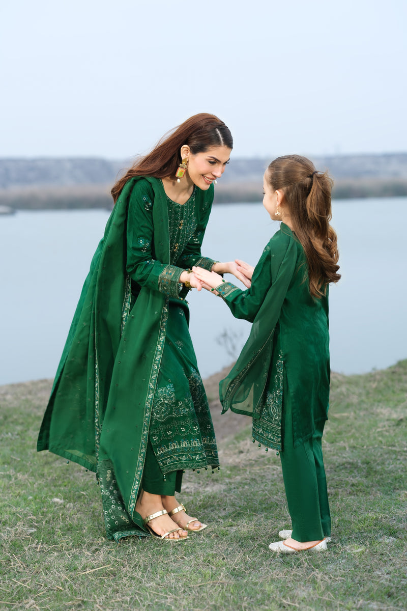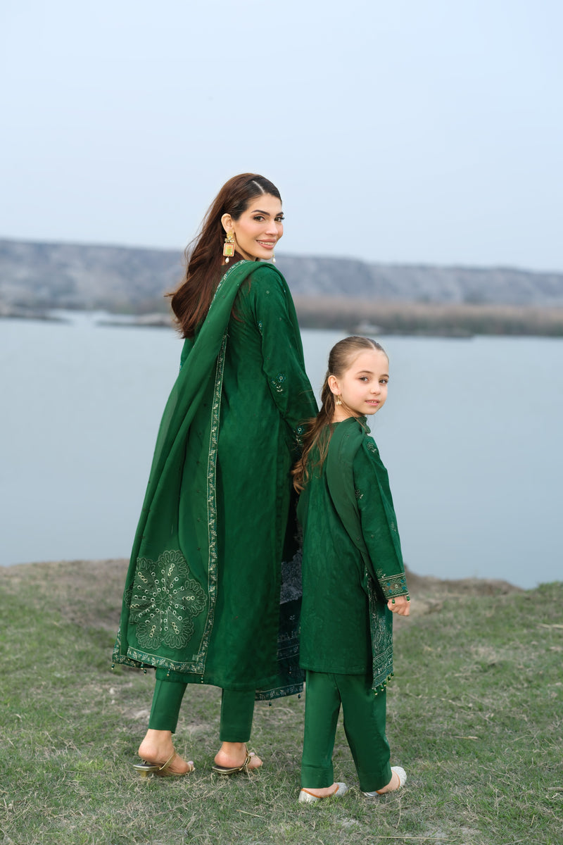 Embroidered jacquard shirt with cotton trousers and embroidered chiffon dupatta.