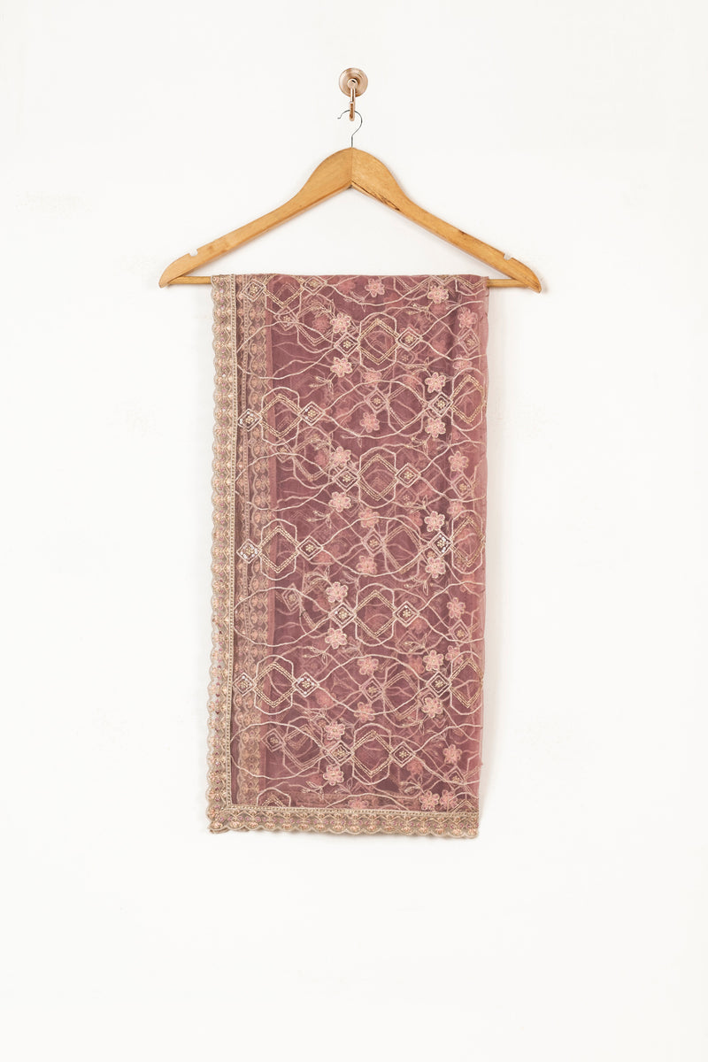 Embellished and embroidered organza shirt with embroidered raw silk trousers and embroidered net dupatta.