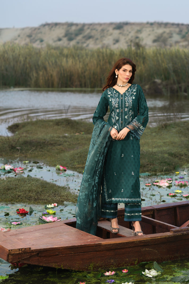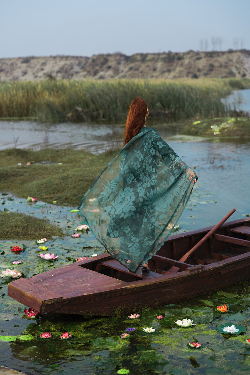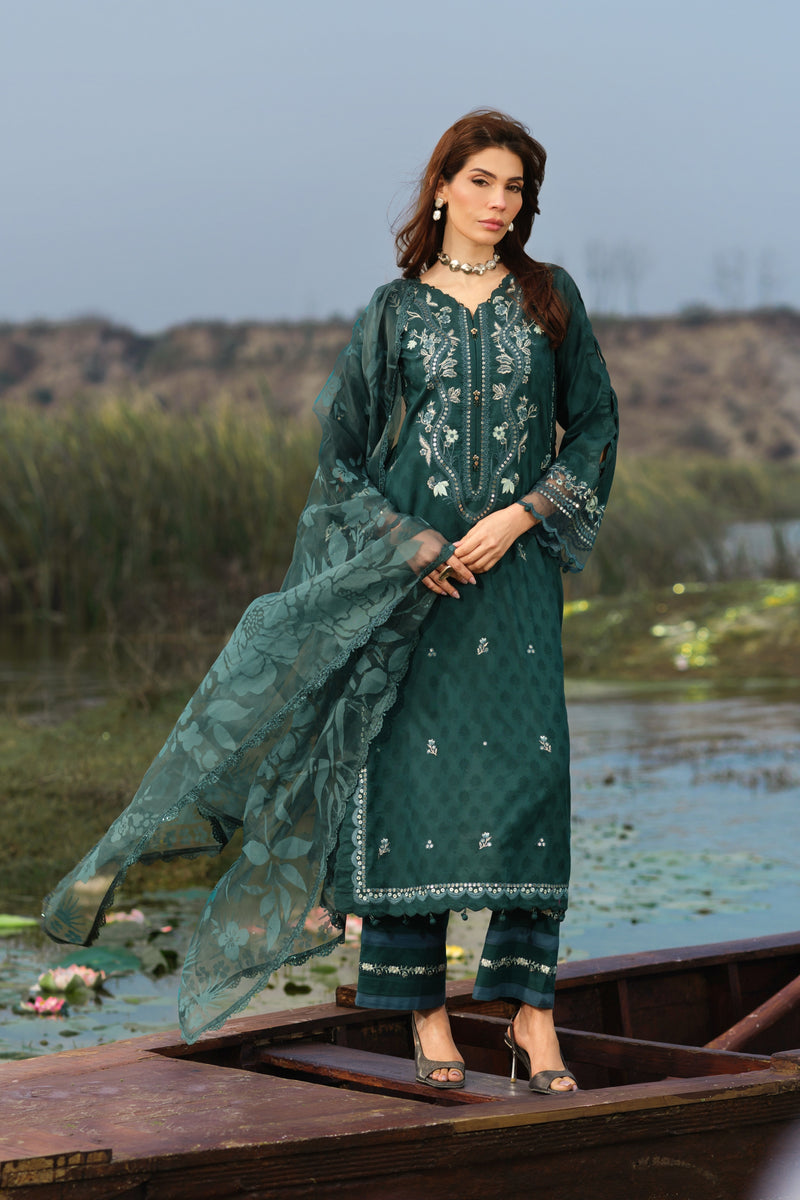 Embroidered jacquard shirt with with cotton trousers and organza dupatta.
