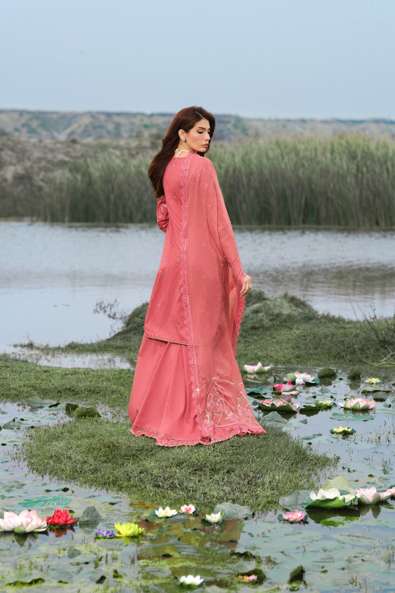 Embroidered jacquard shirt with cotton trousers and embroidered chiffon dupatta.