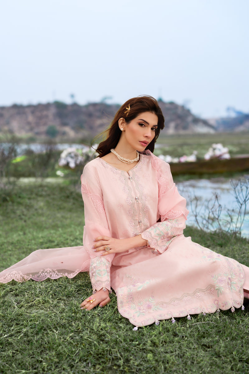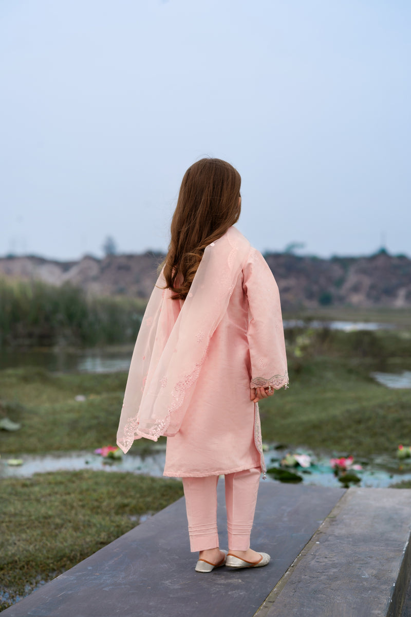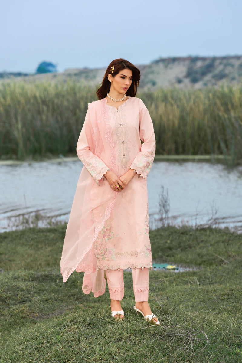 Embroidered jacquard shirt with with cotton trousers and embroidered organza dupatta.