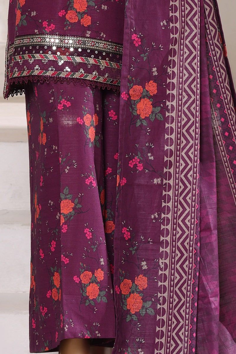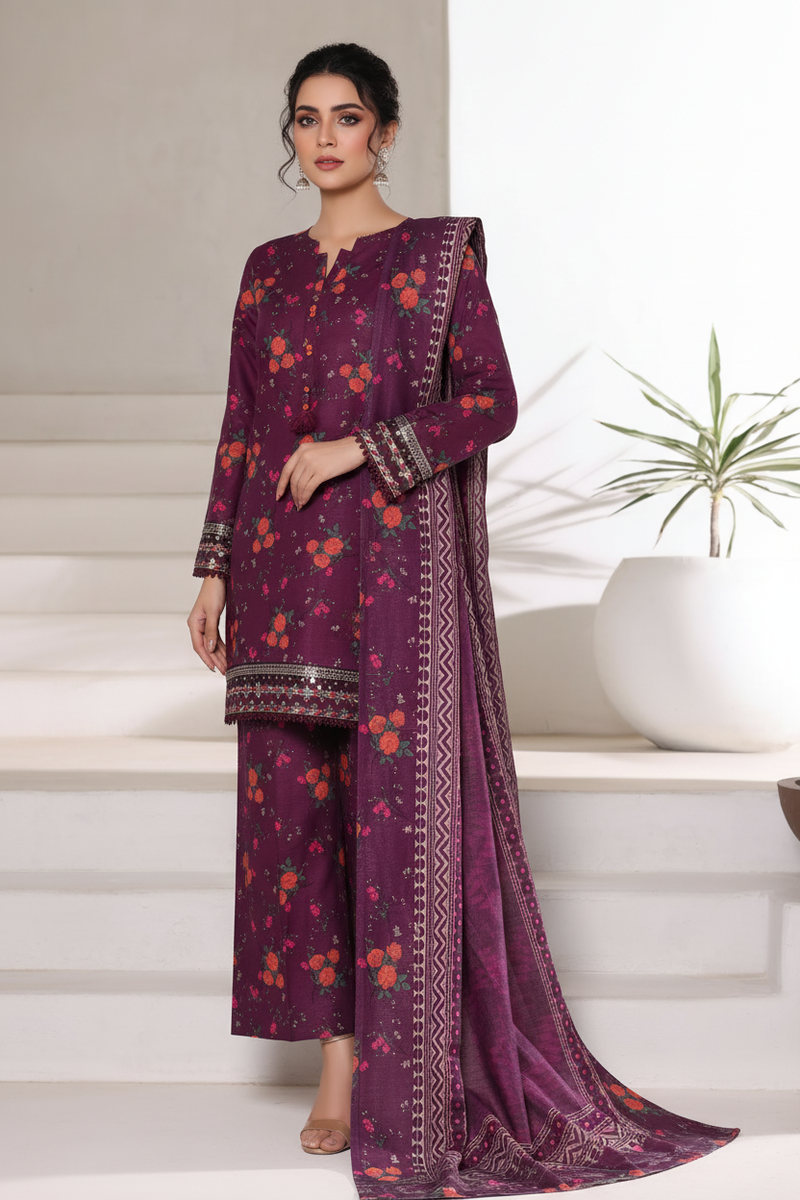Printed embroidered khaddar shirt with printed khaddar palazzo trousers and printed khaddar dupatta.