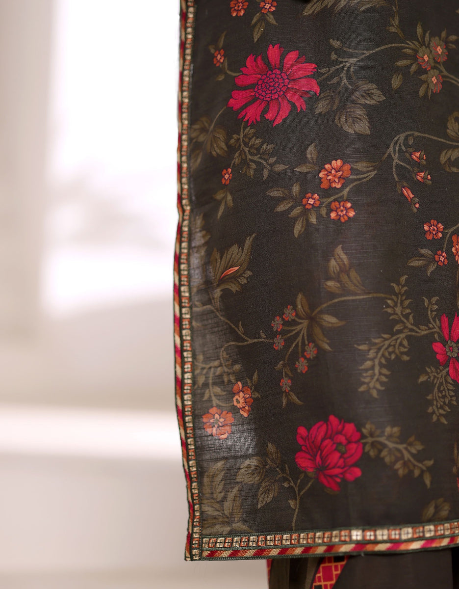 Printed embroidered khaddar shirt with printed embroidered khaddar trousers and printed khaddar dupatta.
