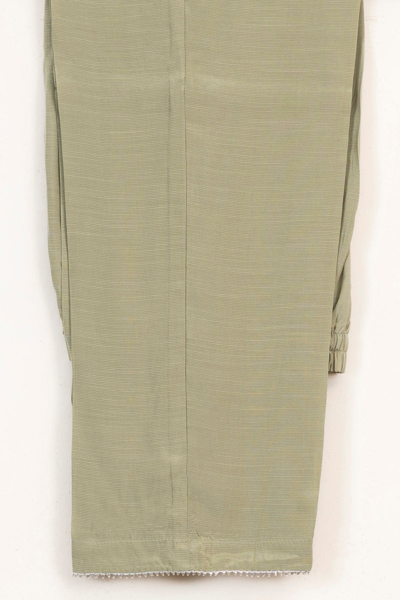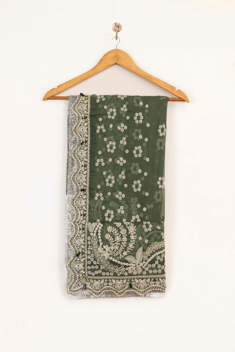 Sequins, thread and tilla embroidered chiffon shirt with raw silk trousers and embroidered chiffon dupatta.