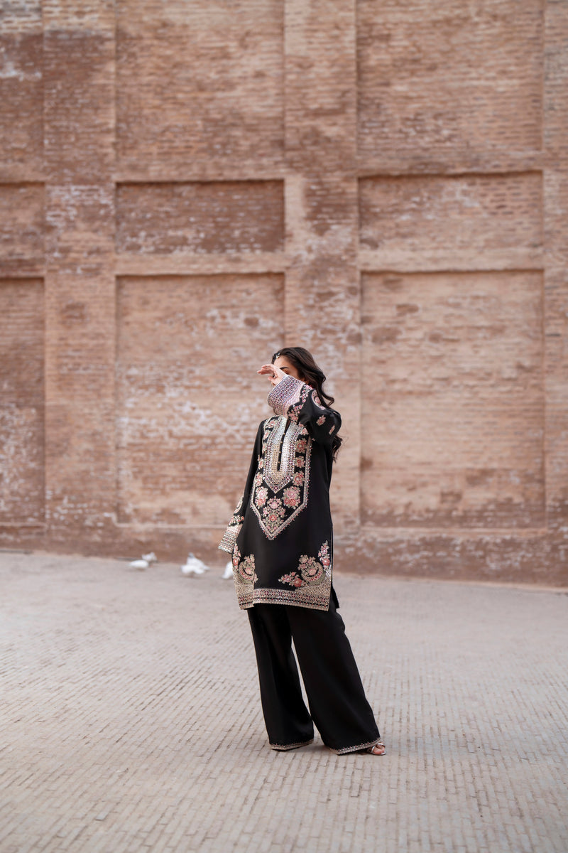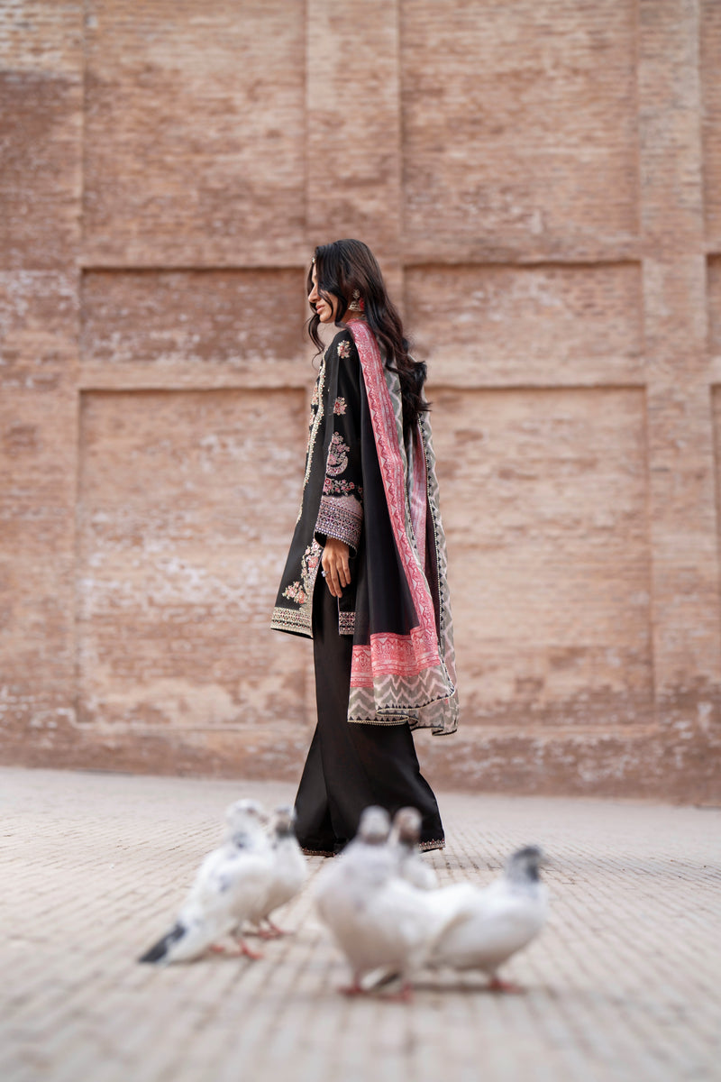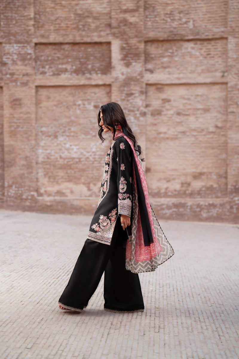 Embroidered viscose shirt with viscose trousers and printed blended dupatta.