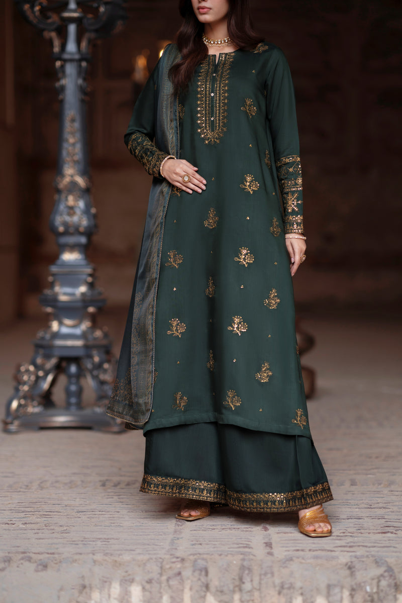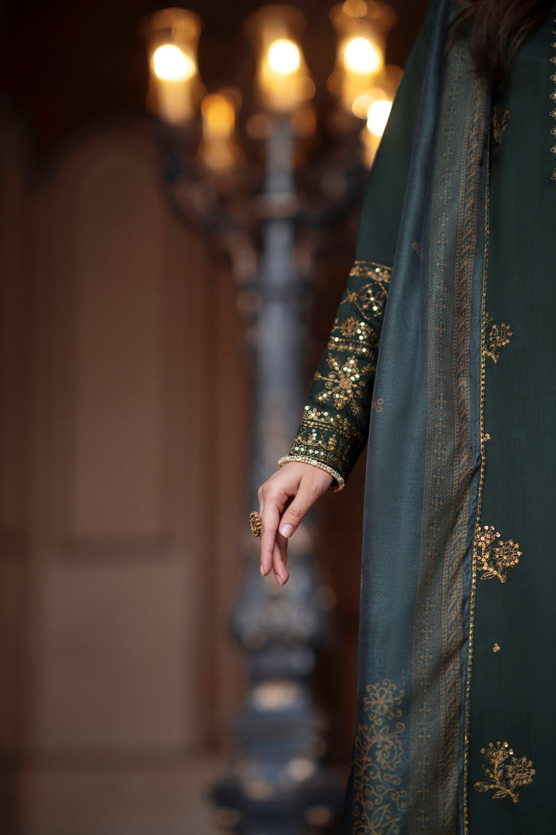 Embroidered viscose shirt with viscose trousers and printed blended dupatta.