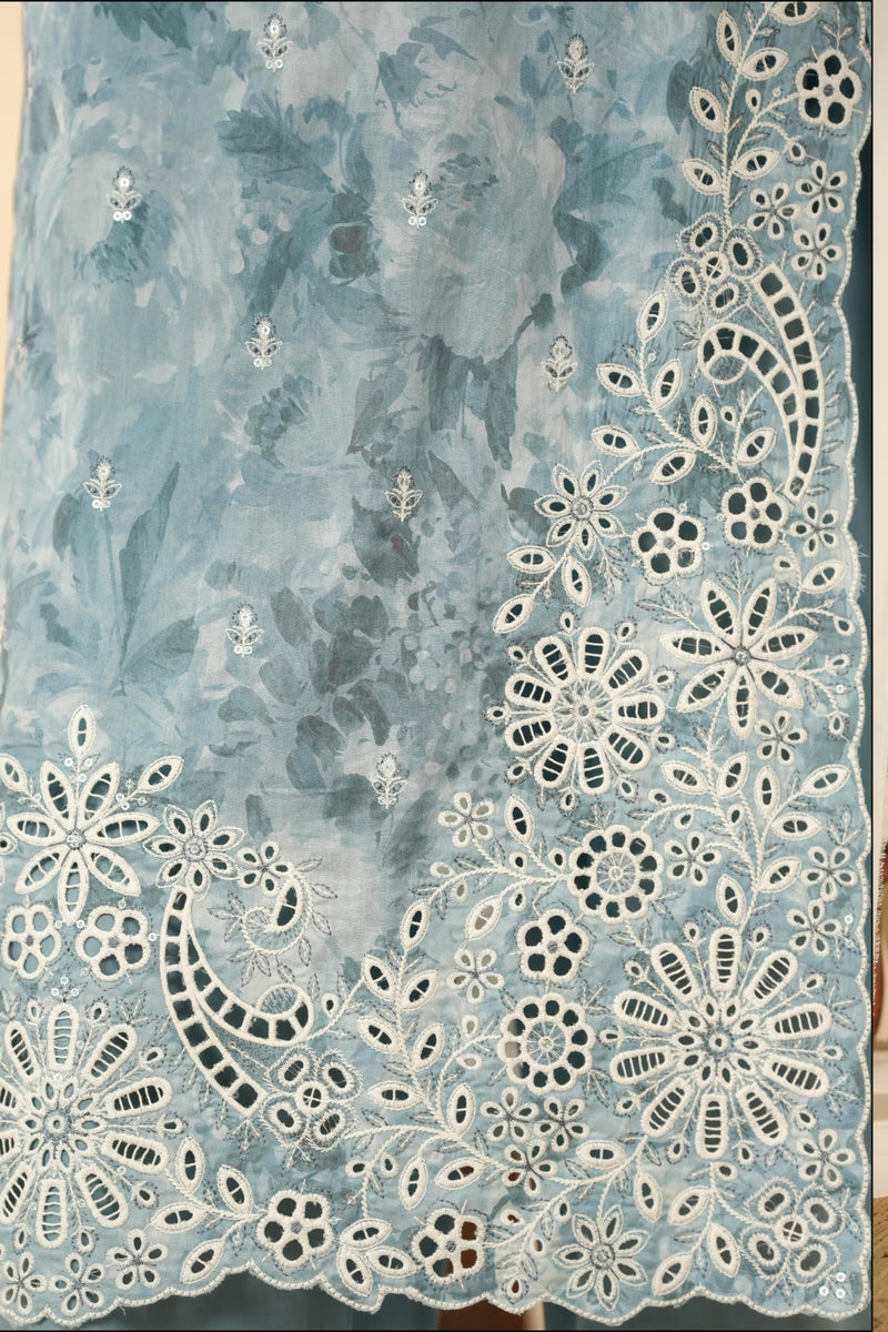 Chikankari embroidered lawn shirt with printed voile dupatta and cambric trousers.