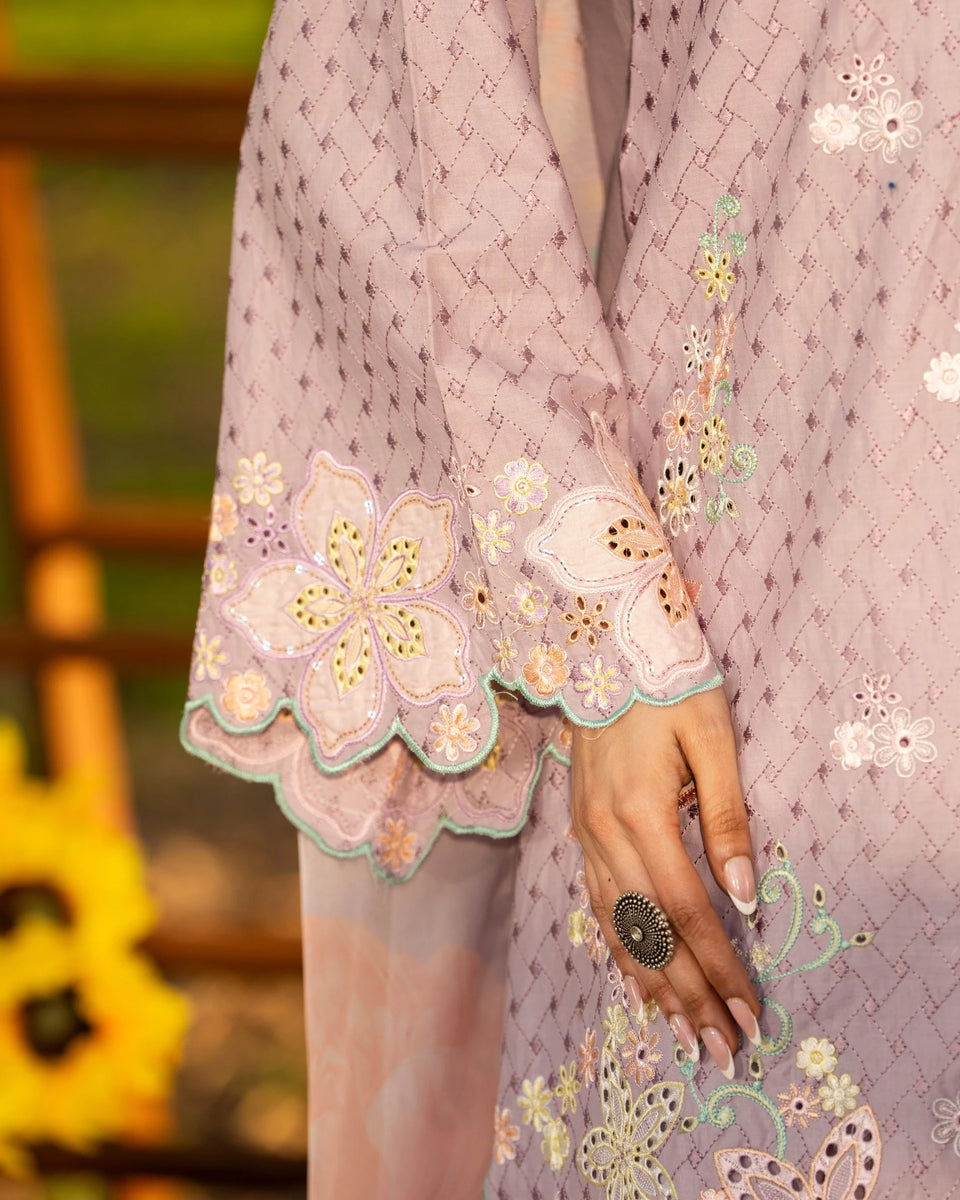 Embroidered cotton shirt with embroidered cotton farshi shalwar and printed tissue silk dupatta.
