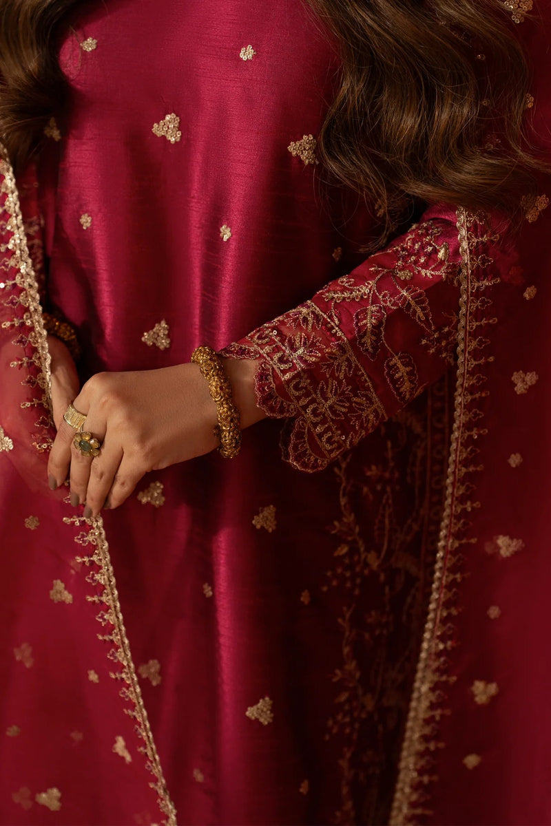 Embroidered blended raw silk shirt with embroidered blended raw silk trousers and embroidered organza dupatta.